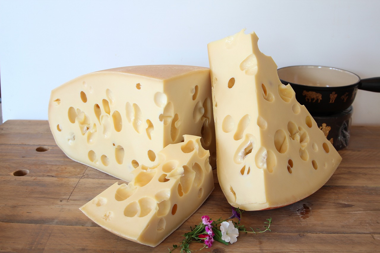 不揃いにいくつも開いた気孔が特徴的。低塩で、風味もマイルド。わずかにナッツやクルミを思わせるような甘味が感じられます。スライスしてサンドイッチにしたり、よく溶けるのでオムレツにもオススメです。ヨ-ロッパでは、サンドイッチや、チーズフォンデュ、オニオングラタンスープ、オムレツ、ピザなどのチーズ料理には欠かせない代表的なチーズです。