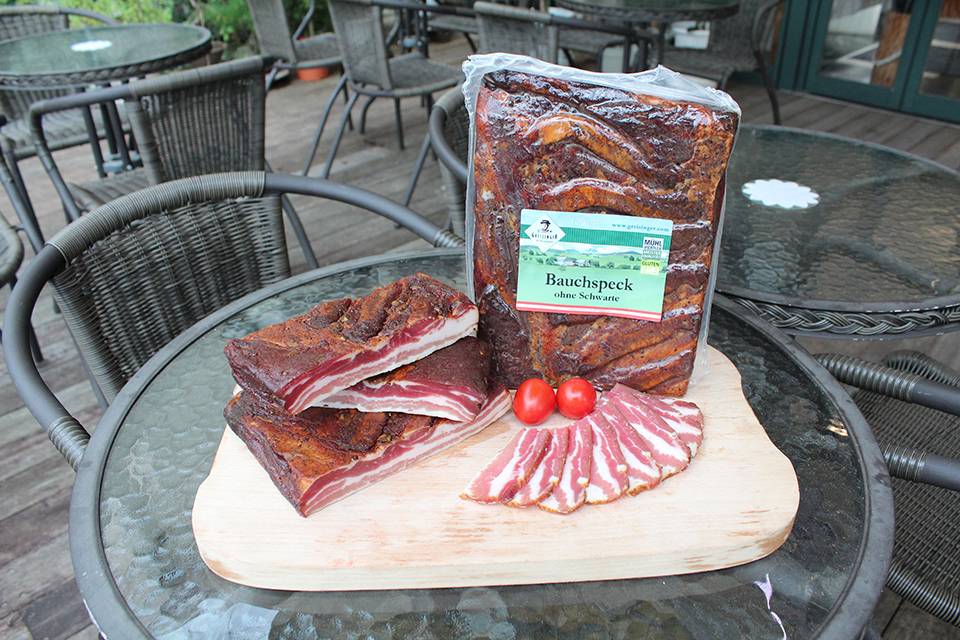 ポークの赤身脇腹肉に旨塩と香辛料、スパイスで熟成。 その後、低温で薫製しながら仕上げられたお肉は、ねっとりと柔らかいのに弾力もある食感。豊かな風味があるので、イタリアのパンチェッタのようにパスタや温野菜、ポトフやスープのアクセントとしてなどいろいろな料理にお使いいただけます。ブロックから切り分けてお届けします。スライス、厚切り、お好みの方法でお召し上がり下さい。