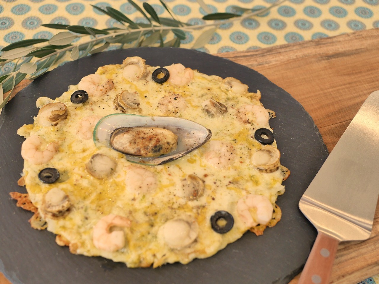 バジルソースをベースに、プリプリのエビ、柔らかいベビーホタテ、パーナ貝をトッピングしました。